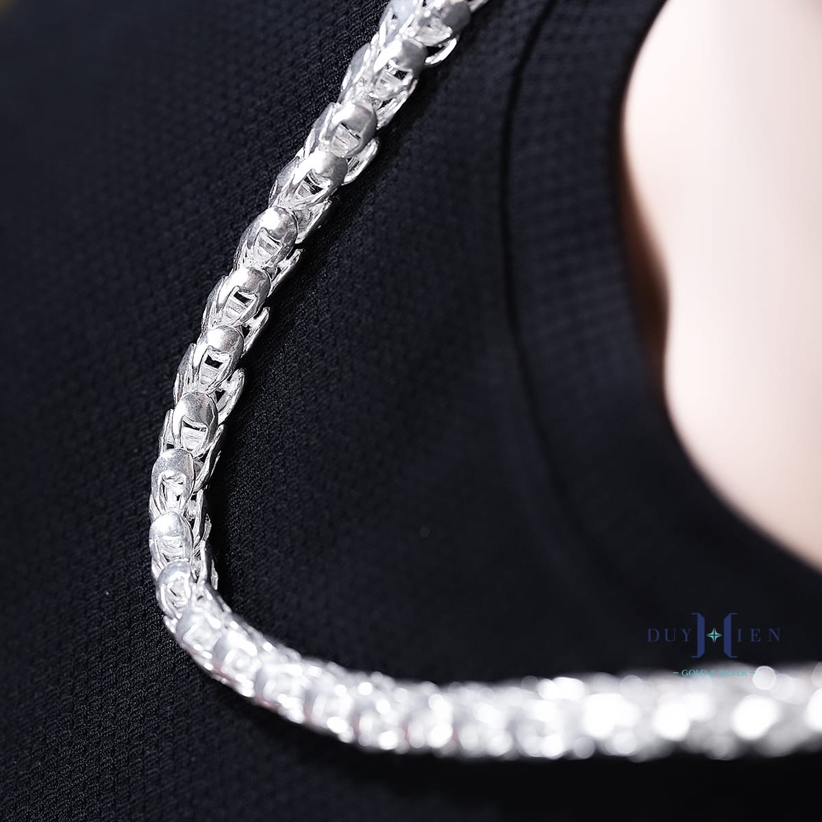 Dây chuyền có kiểu dáng Dạng dây vảy rồng Mắt dây được móc nối sắp xếp vô cùng phức tạp mà chắc chắn tạo nên kiểu vảy rồng độc đáo nổi bật .